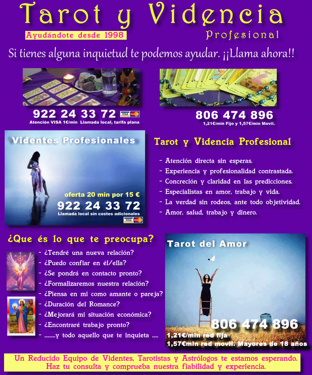 ![]() 806 474 896 - Consultas directas. 922 24 33 72 - Consultas Tarot Visa |